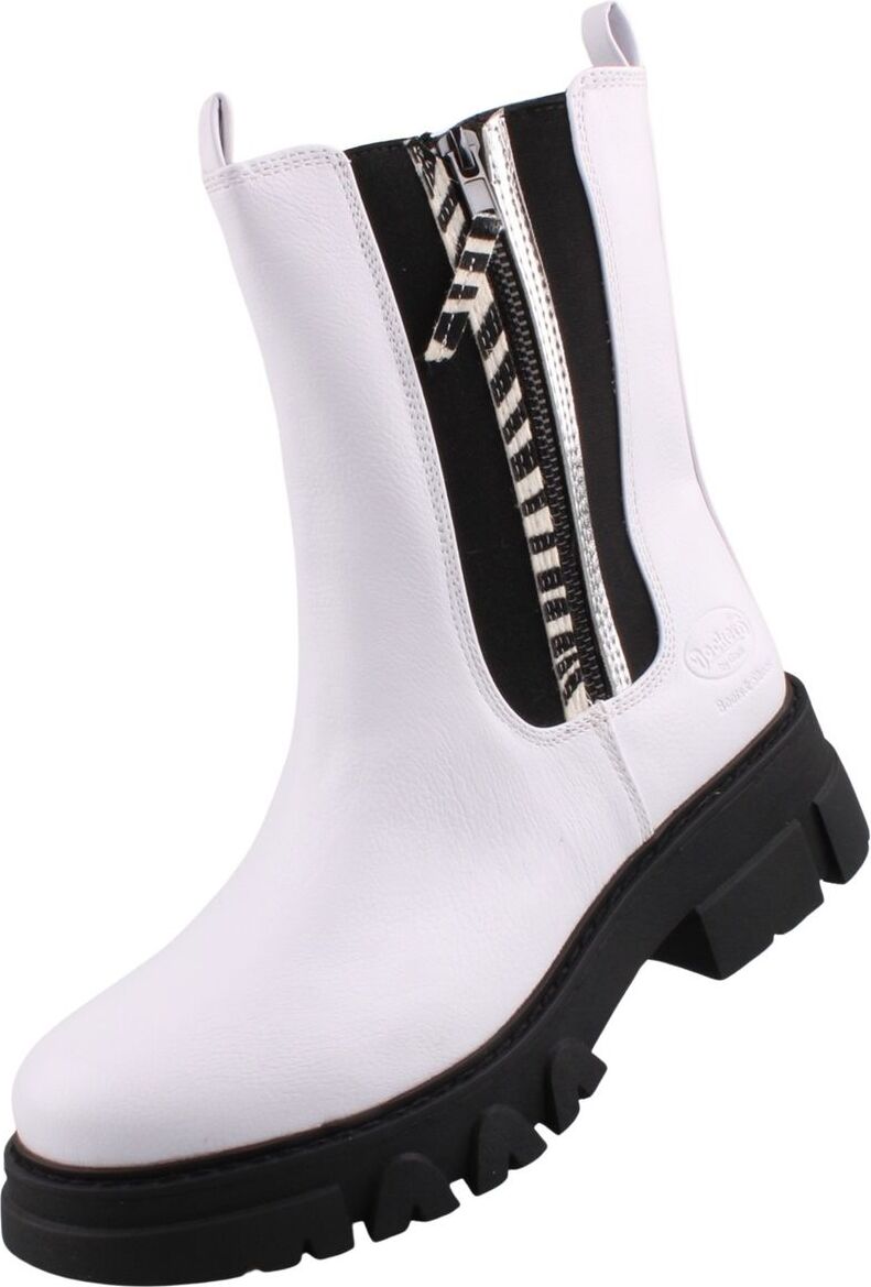 Damen Chelsea Boots Weiß/SchwarzStiefel aus Kunstleder mit den markanten Stretcheinsätzen eines Chelsea Boots. +