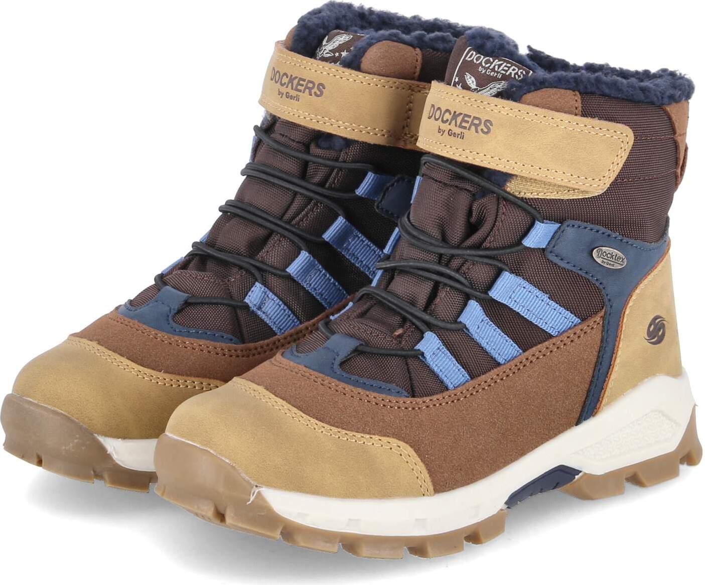 Die Dockers Kinder Stiefeletten aus einem braunen Kunstleder-Textil-Mix bieten optimalen Schutz für kalte Tage. +