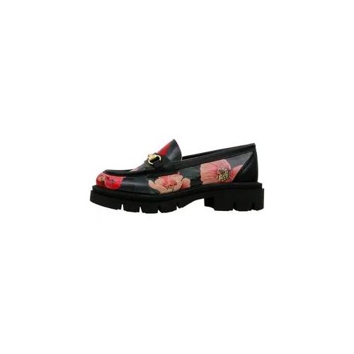 Das tiefschwarze Obermaterial wird durch rote und rosafarbene Mohnblumen akzentuiert, die dem Schuh eine feminine und zugleich stilvolle Note verleihen. Das goldfarbene Metall-Detail auf dem Spann sorgt für einen eleganten Retro-Touch und rundet den Look harmonisch ab.