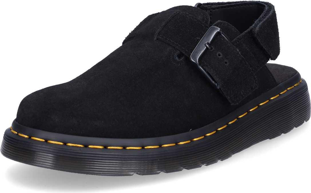 Martens Damen Clog aus Wildleder in Schwarz mit Innensohle aus Textil, geschlossener Vorderkappe und Klettverschluss am Fesselriemen