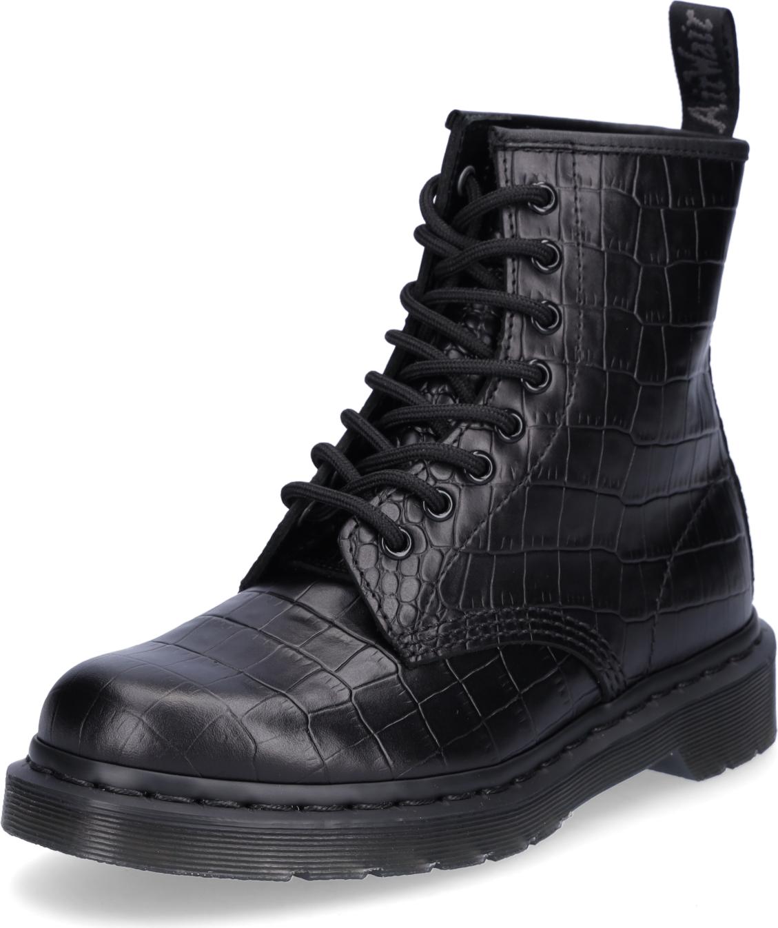 Martens Damen Schnürboot aus Leder in Croco-Optik in Schwarz mit Plateausohle, 8-Loch-Schnürung und Goodyear Rahmennaht