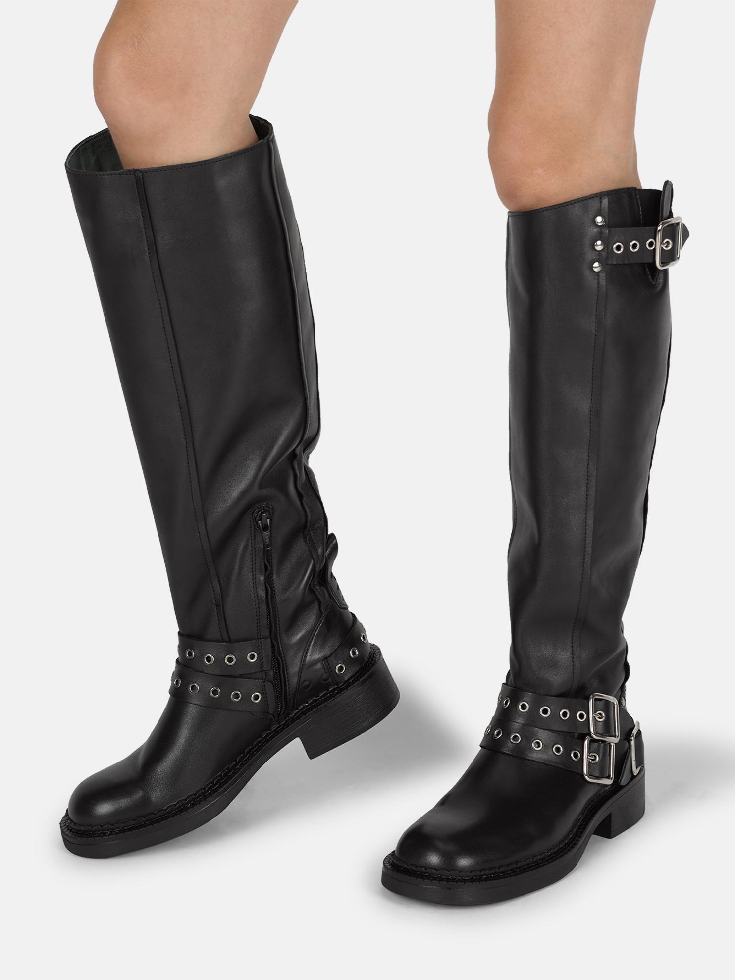BRENDA T010 von Felmini ist ein kühner, hoher Stiefel mit einem breiteren Schaft und auffälligen Schnallendetails. +