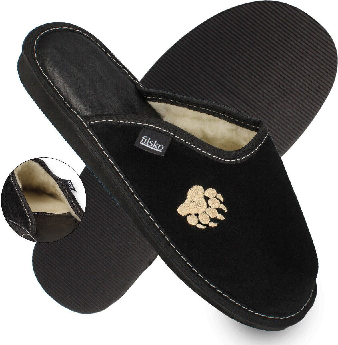 filsko Skagen Herren Hausschuh weiches Veloursleder mit Schafwolle gefüttert, Tatzen Stickerei (schwarz)
