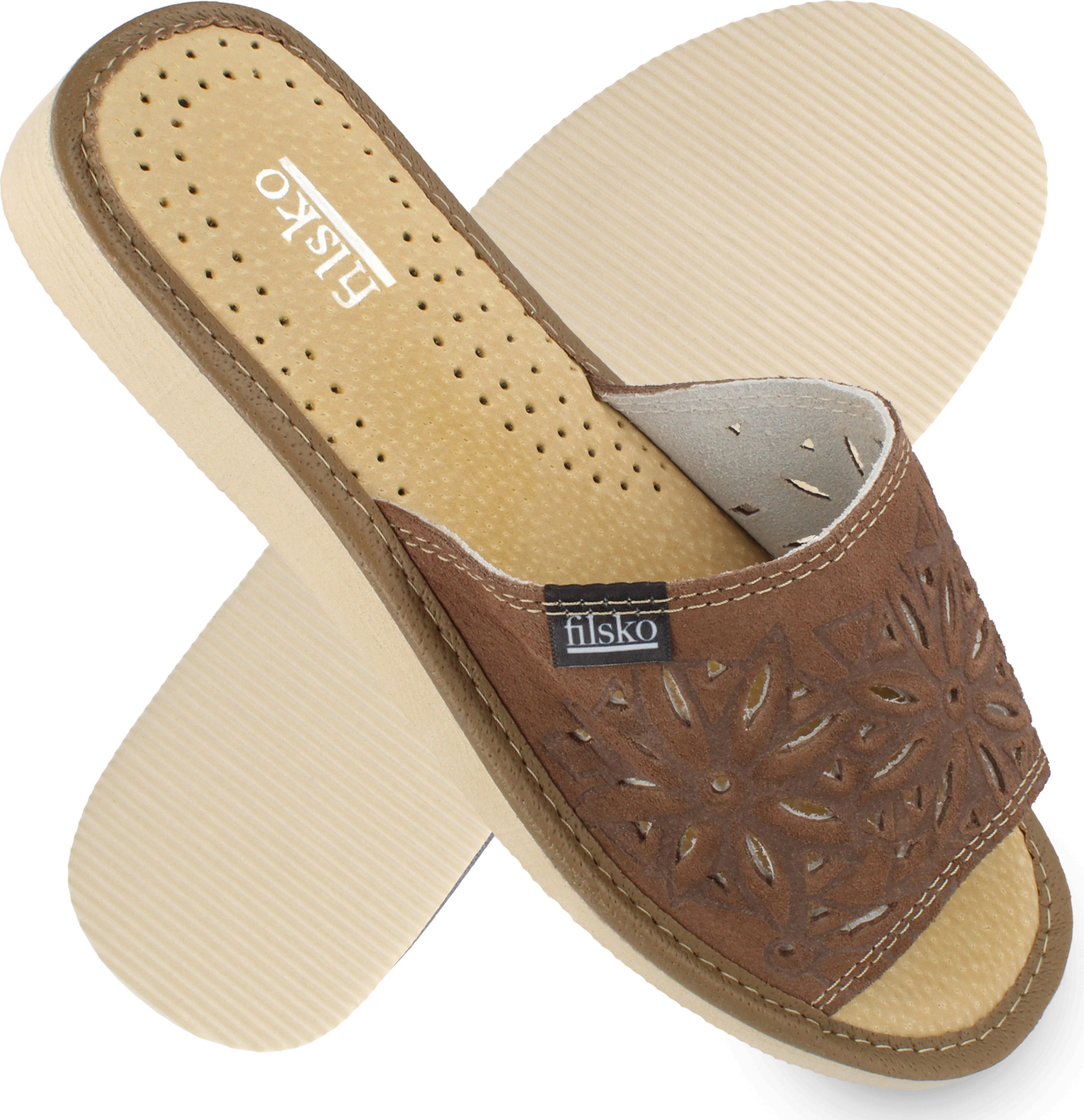 filsko Zafra Damen Hausschuh Veloursleder mit Blumenmuster, offene Pantoletten, Slip-On (braun)