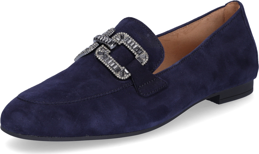 Die Gabor Slipper 65.210.16 für Damen in Blau überzeugen mit hochwertigem Veloursleder und einer dekorativen Vorderblattspange. +