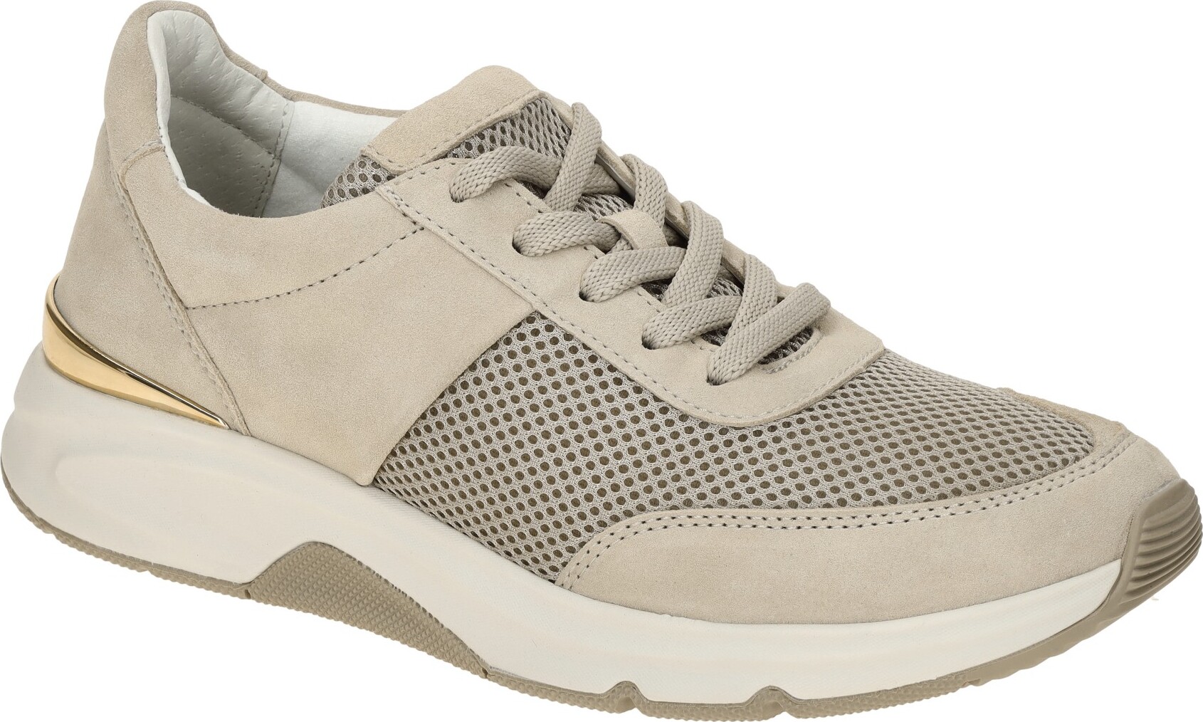 Marke: GaborModell-Nr.: 66.897.33Modellname: ROLLINGSOFTArt: Damenschuhe - sportliche Schnür- Halbschuhe, SneakersFarbe: beige +, gold metallic +, Sohle in hellgrau +, taupe (oasi)Obermaterial: Velourleder +, Textil / Mesh (Mesh, Dreamvelour)Innenfutter: Textil - weich gepolstertInnensohle: Textil FußbettWechselfußbett: herausnehmbare InnensohleLaufsohle: GummisohleVerschluss: 5fach SchnürungAbsatz: flach - kein AbsatzSchuhform: rundGrößenangabe: fällt normal ausWeitenangabe: G - normal Weiteinterne Artikelnummer für Ihre Rückfragen: 236-40-0134