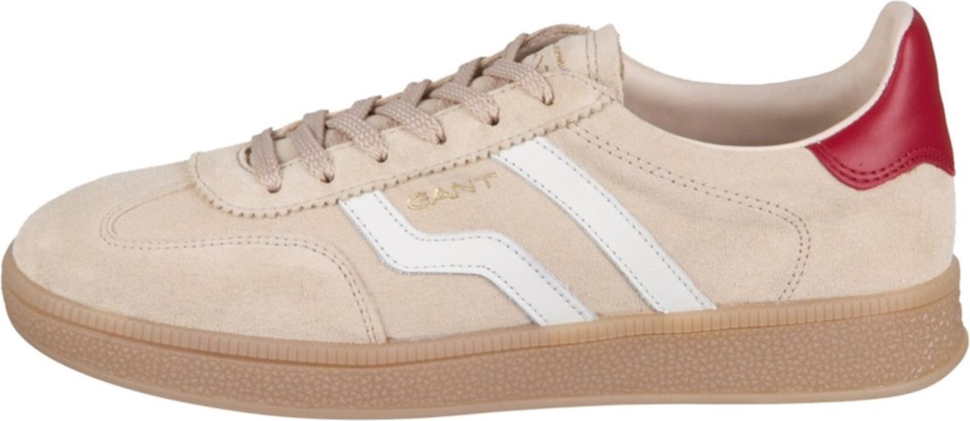 In Beige gehaltenes Rauleder trifft auf markante weiße Seitenstreifen und eine kontrastierende rote Fersenklappe, der goldene Markenschriftzug bleibt bewusst subtil. Die Konstruktion aus langlebigem Echtleder wird durch verstärkte Partien an Ferse und Zehen abgerundet, der gepolsterte Einstieg und die runde Spitze erhöhen den Komfort.