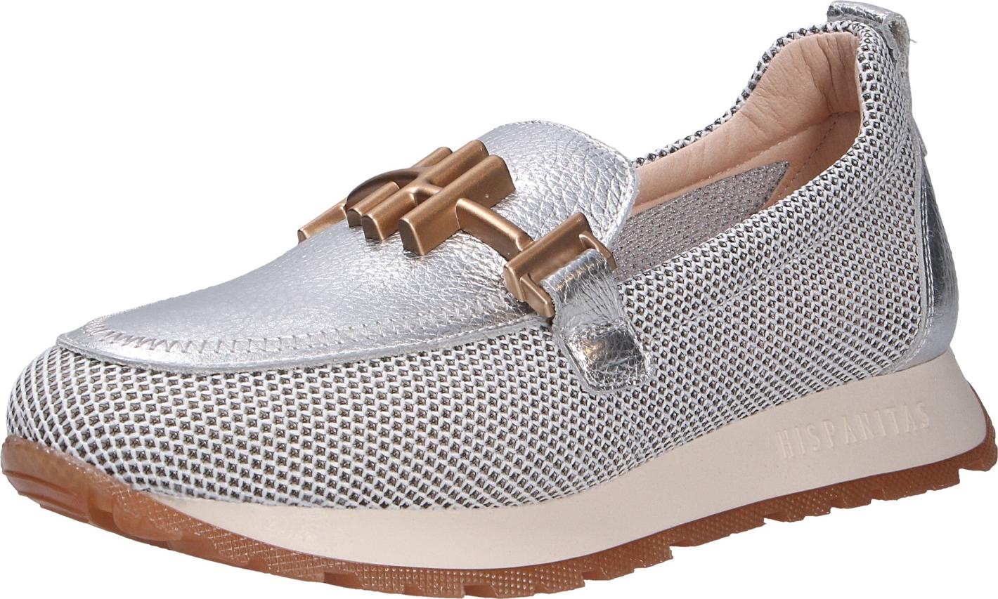 Hispanitas Damen Slipper aus Mesh in Weiß und Leder in Silber mit Dekoration in Metallic, Wechselfußbett aus Leder und besonders gedämpfter Laufsohle