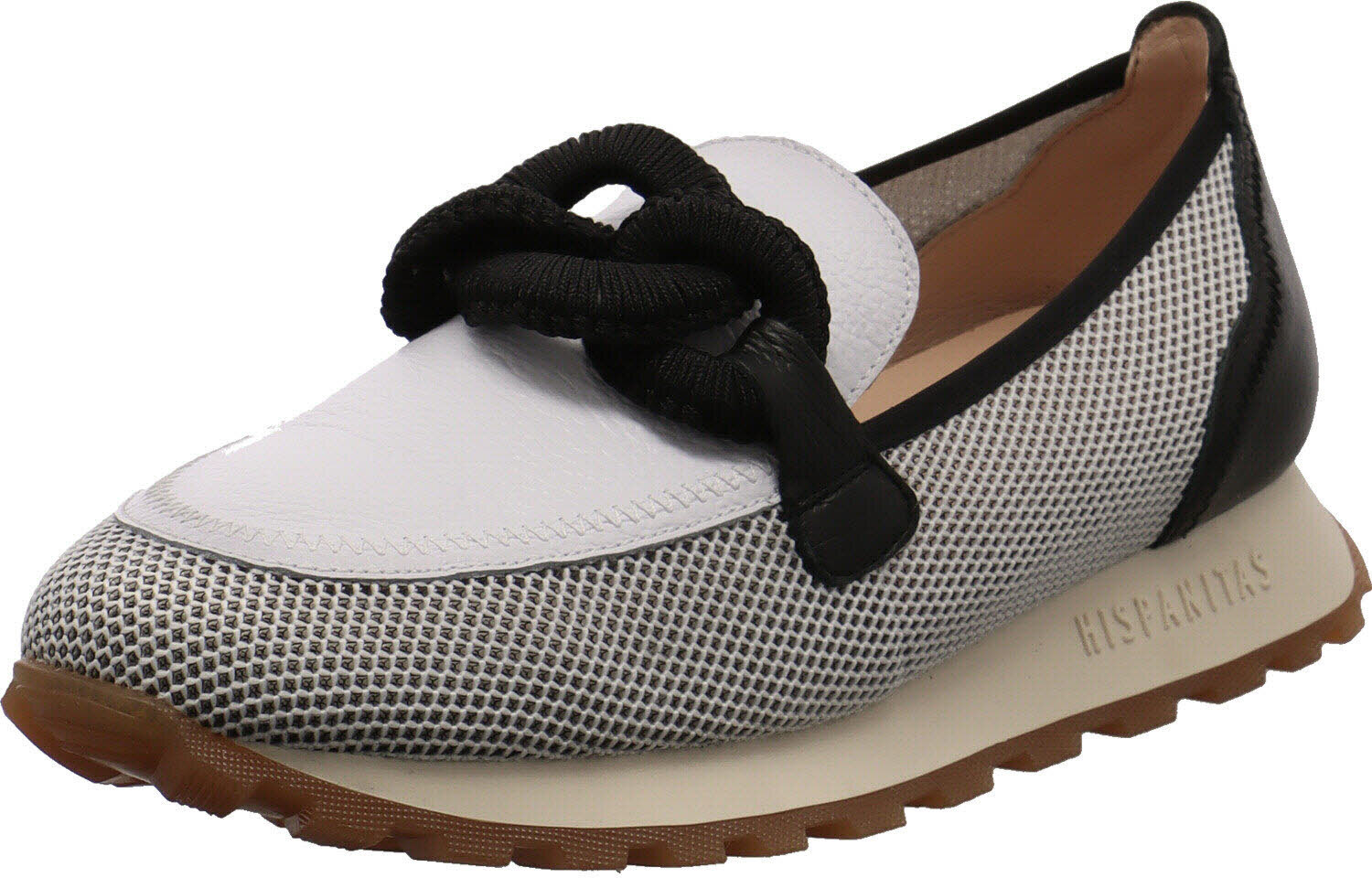 Dieser elegante Damen Slipper Loira von der spanischen Marke Hispanitas ist ein absolutes Must Have in der neuen Saison.Der Schuh wurde aus einer Kombination aus hochwertigem Rindsleder in Schwarz und Weiß mit atmungsaktivem Textil Mesh an der Seite gefertigt und zieht mit Sicherheit Blicke auf sich. +