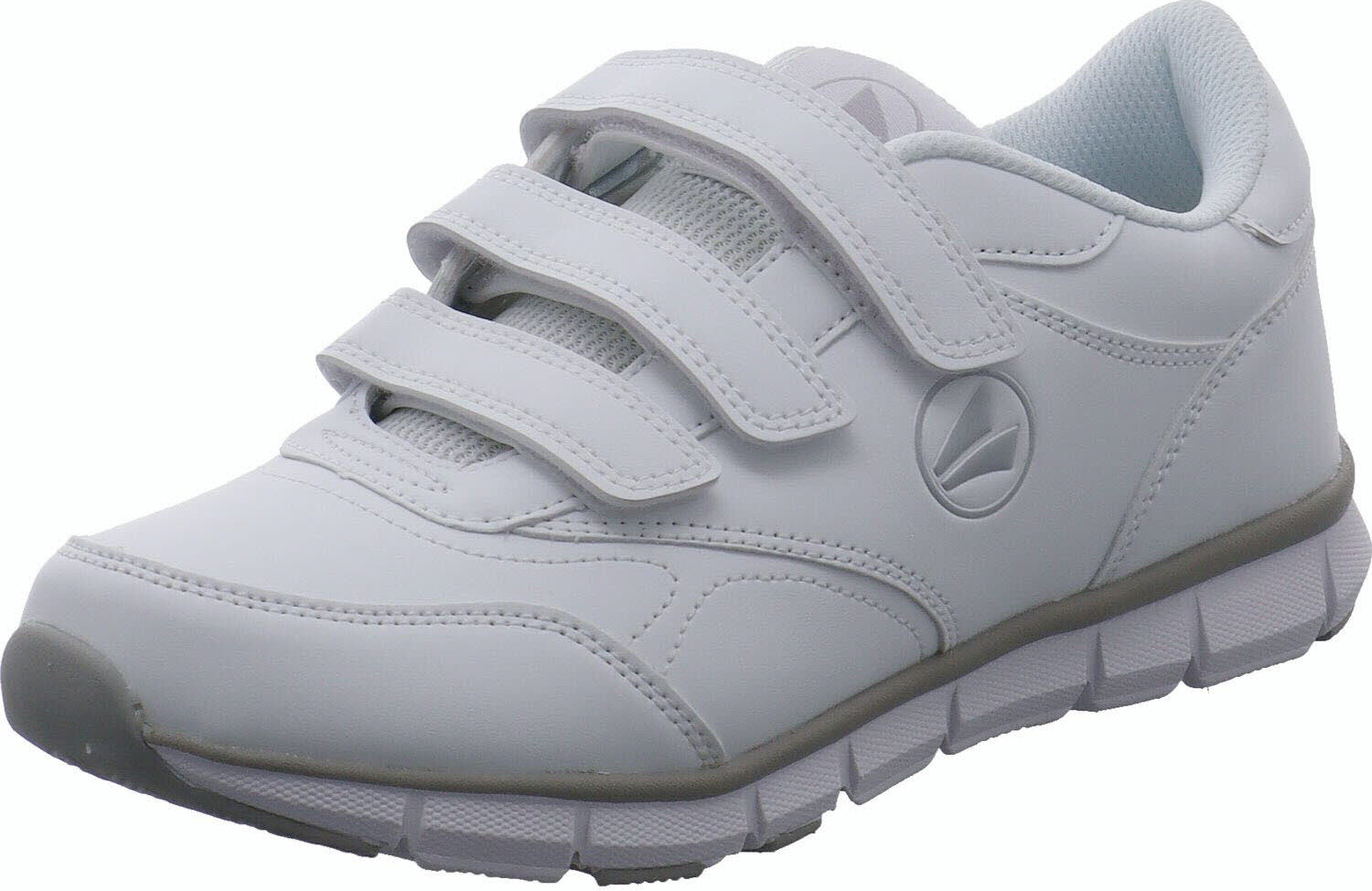 Das Obermaterial aus Kunstleder in Weiß wirkt sportiv und ist mit tonalen Ziernähten versehen. Durch den 3 fachen Klettverschluss ist ein leichter Einstieg möglich und der Schuh lässt sich optimal an den Fuß anpassen.