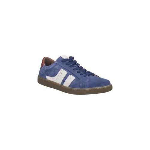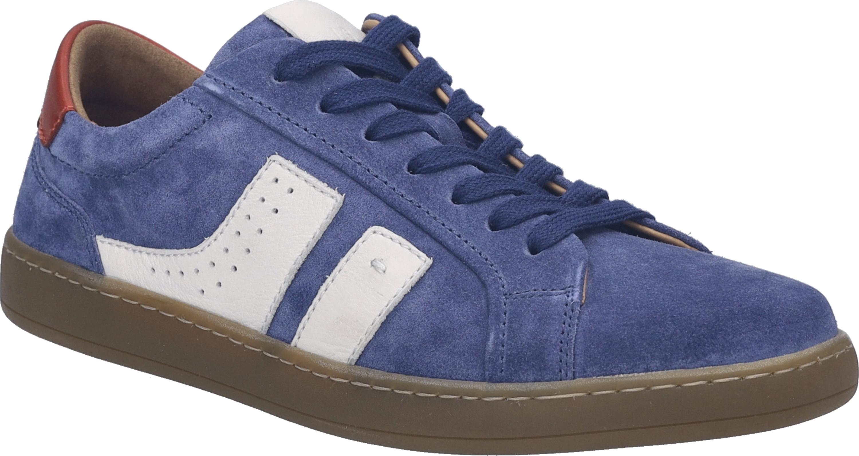 Urban, klar und komfortabel: Der Herren-Sneaker LIO 07 von Josef Seibel kombiniert blaues Rauleder mit kontrastierenden weißen Seitenstreifen und einer markanten roten Fersenklappe. +