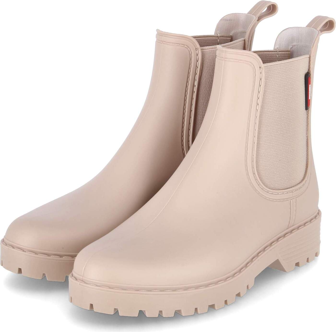 Die beigefarbenen Chelsea Boots von Kaerlek im Gummistiefel-Stil präsentieren sich in einem modernen Look mit zartem Rosastich – perfekt für stilbewusste Regentage. +