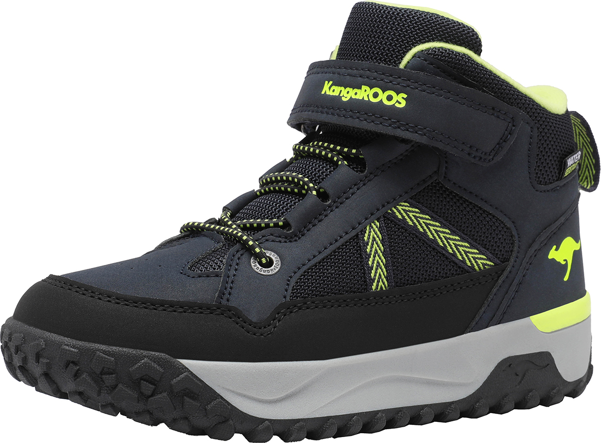 Der K-NB Garp EV von Kangaroos für Kinder ist ein praktischer Hightop Sneaker in Blau und Schwarz für nasskalte Tage.Optisch besticht der Schuh durch sein modernes Design mit Highlights in leuchtendem Grün.Das Obermaterial des Sneakers besteht aus pflegeleichtem Synthetik und textilen Parts und ist dank einer speziellen Beschichtung wasserabweisend. +