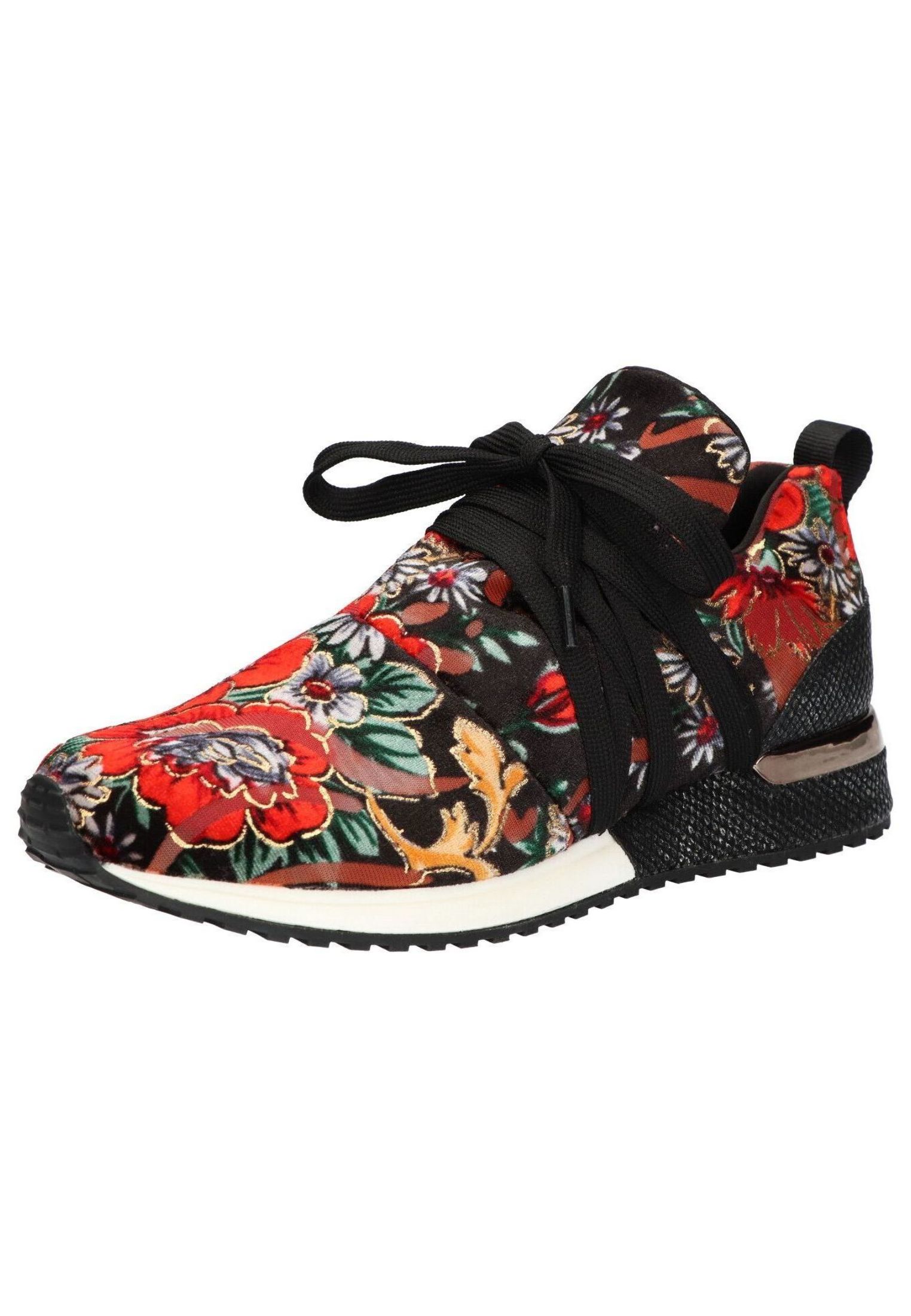 Ein Statement mit sanfter Note: Der schwarze Low Sneaker von La Strada setzt auf ein markantes florales Muster und eine Ferse in Reptildesign, die dem femininen Auftritt eine Prise Edge verleiht. +