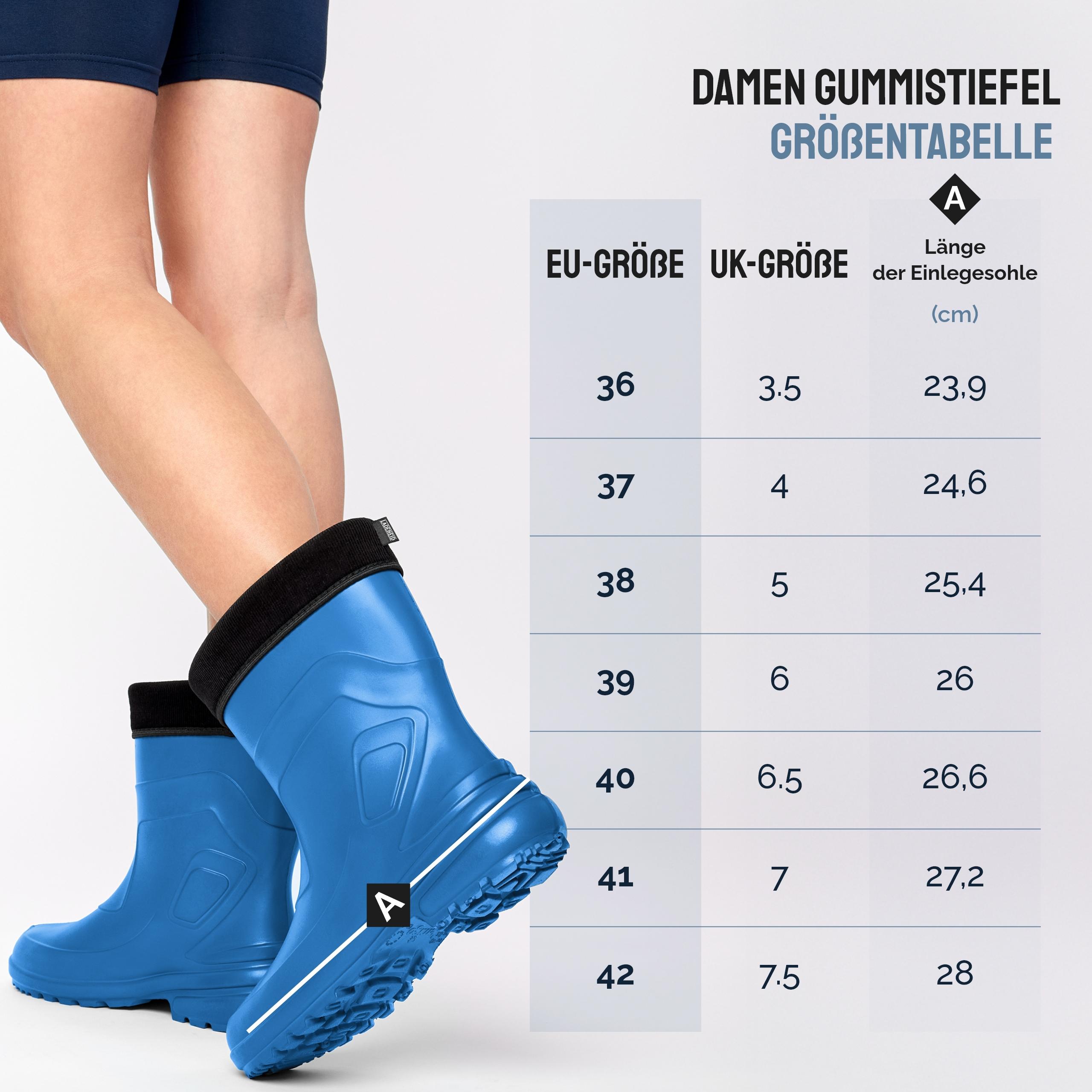 Damen Wellingtons mit herausnehmbaren Innenschuh.Hergestellt aus einer neuen Generation von besonders leichtem und flexiblem EVA.Dadurch sind die Stiefel sehr bequem und schränken die Bewegungsfreiheit nicht ein.Das Material zeichnet sich durch seine Robustheit, gute Isolation gegen Kälte und Schockabsorption aus.Selbst bei Temperaturen bis zu -30°C behält das Material seine besonderen Eigenschaften bei.Der Innenschuh ist mit einer Manschette aus Kord abgeschlossen, welche zusätzlichen Kälteschutz bietet.Je nach Wetterbeschaffenheit kann der Innenschuh einfach herausgenommen werden.Somit eignen sich die Stiefel für das ganze Jahr.Der Innenschuh ist waschbar und trocknet schnell.Die Stiefel schützen vor Kälte und Regen.Sie sind wasserfest und einfach zu reinigen.Innenmaße nach Größen: 36 (22.5cm, 8.9in), 37 (23.5cm, 9.3in), 38 (24cm, 9.4in), 39 (24.5cm, 9.6in), 40 (25.5cm, 10in), 41 (26cm, 10.2in), 42 (26.5cm, 10.4in).Das Gewicht pro Schuh bei der Größe 37 beträgt ca. +