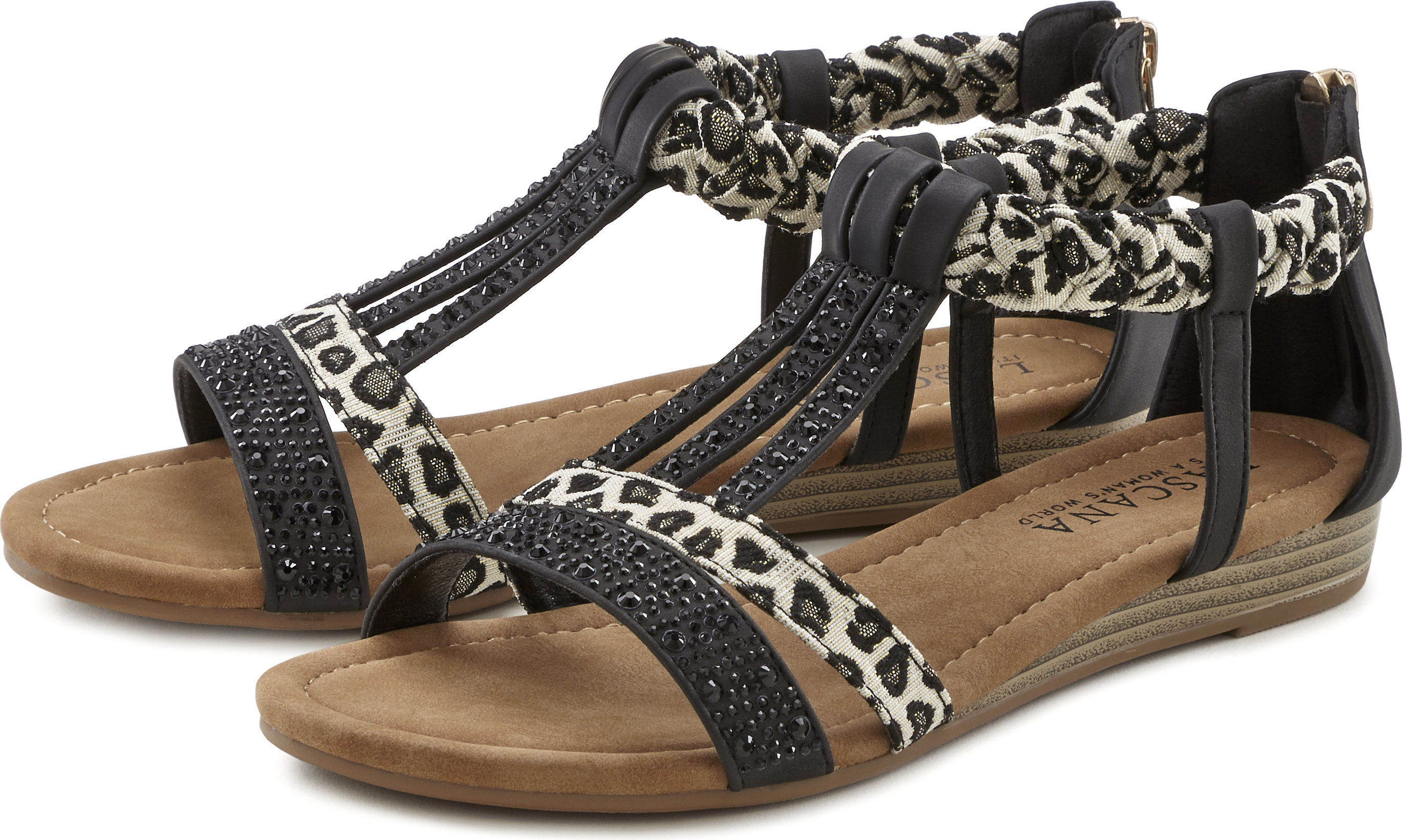 Wenn du in diesem Sommer modisch glänzen möchtest, ist die LASCANA Sandale mit Verzierung und kleinem Keilabsatz die perfekte Wahl. Sei der Hingucker auf jeder Party und verleihe deinem Outfit das gewisse Extra. Mit der aufwendigen Verzierung aus Strasssteinchen wird die Sandalette zum Highlight deiner Schuhsammlung. Das schwarze Leo-Design ist modern und passt perfekt zu jeder Kleidung. +