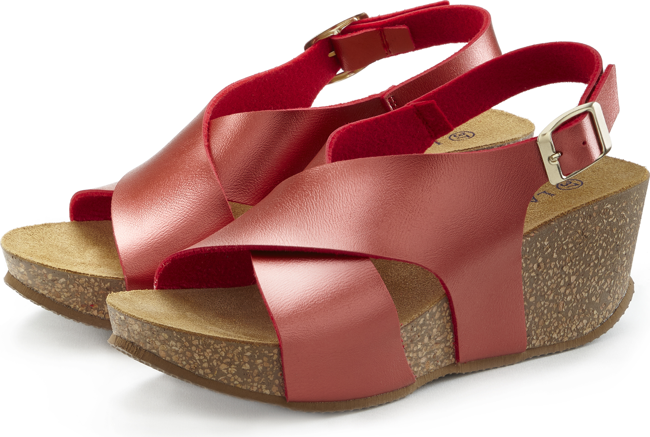 Der sommerliche Absatzschuh verfügt über ein ergonomisch geformtes Fußbett aus Kork, das deinen Füßen eine echte Wohltat verspricht. Der trendbewusste Style der Sandalette wird in den breiten, vorn überkreuzten Riemen fortgesetzt.