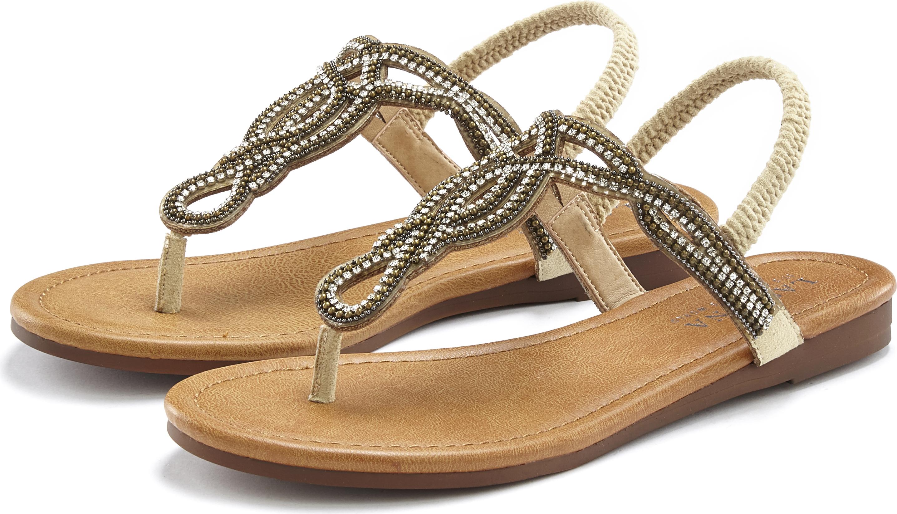 Du suchst noch einen schicken Schuh, der dich durch den Sommer begleitet? Wie wäre es denn mit der Sandale von Lascana? Der elegante Zehentrenner begeistert auf Anhieb mit seinem edlen Design: kleine Schmucksteinchen zieren die vorderen Riemen, während der Riemen um den Hacken eine ansprechende Textiloptik besitzt. +