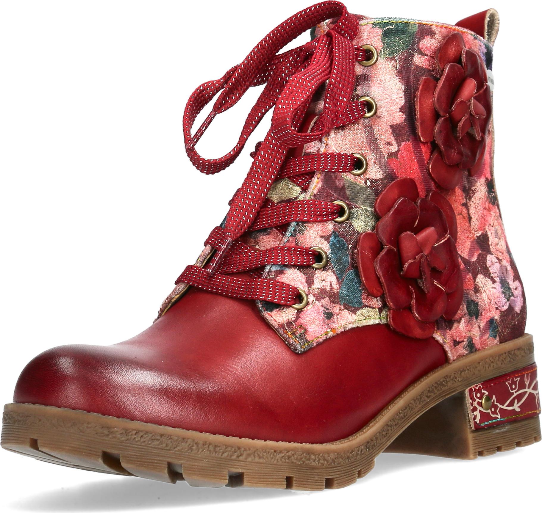 Sie begeistert und durch ihr hochwertiges Obermaterial aus Echtleder in unserer Lieblingsfarbe Rot. Am Schaft ist die Stiefelette mit einem bunten Blumen Print verziert.