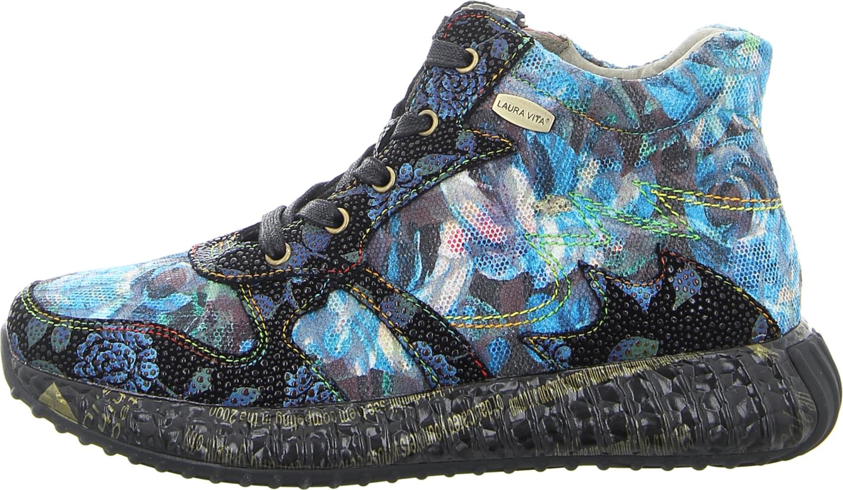 Entdecken Sie den einzigartigen Charme des LAURA VITA High-Sneakers in strahlendem Blau – der perfekte Begleiter für alle, die Stil und Komfort mühelos verbinden möchten. Dieser hochwertig verarbeitete Sneaker aus Leder und Textil vereint ein lebhaftes Blumenmuster mit moderner Designkunst und sorgt somit für einen frischen, sommerlichen Look. +
