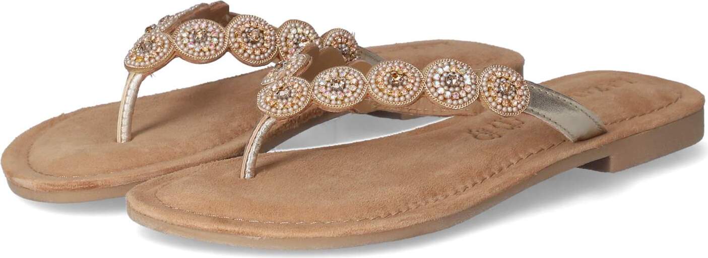 Die feine Sandale wird durch die Perlenaufnähung zum Blickfang. Die gepolsterte Decksohle aus Leder sorgt zusätzlich für einen angenehmen Tragekomfort.