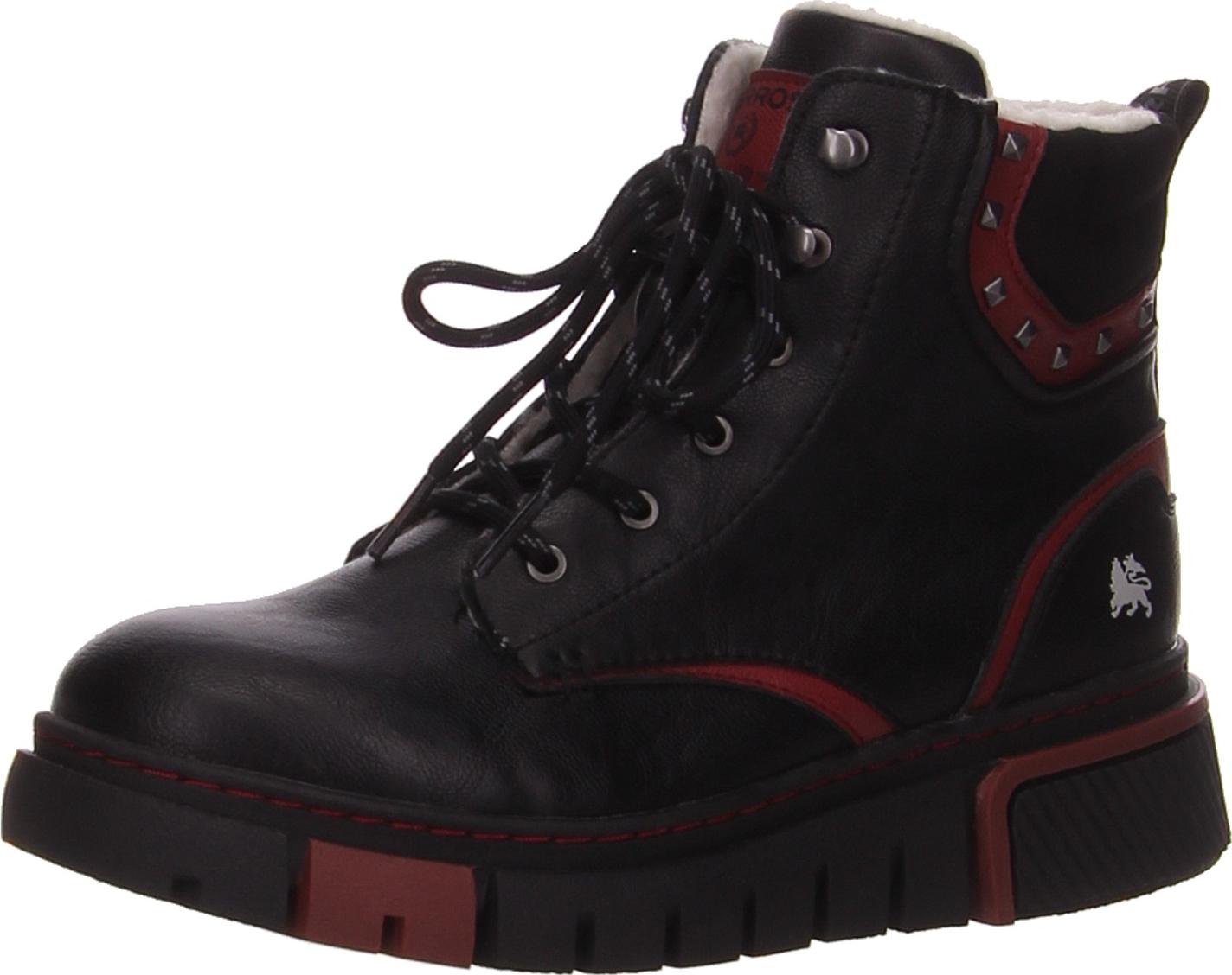 Das Obermaterial aus Kunstleder in Schwarz ist authentisch genarbt und wird durch Akzente in Rot gekonnt in Szene gesetzt. Der Schaft ist mit einem Einsatz versehen, der angenehm gepolstert ist und durch Nieten toll in Szene gesetzt wird.