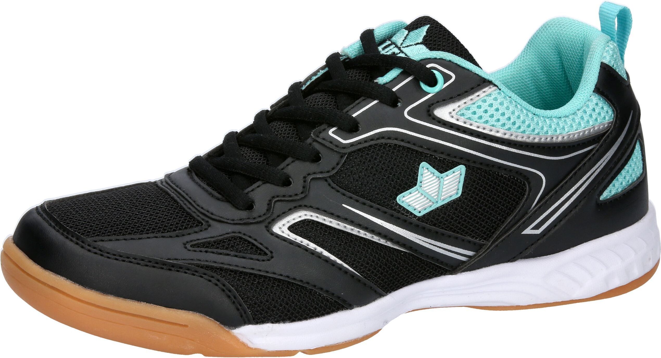 Mit seinem modernen Design in den Farben Schwarz, Türkis und Silber ist der Indoorschuh nicht nur funktional, sondern auch ein echter Hingucker. Das atmungsaktive Mesh-Obermaterial sorgt für eine gute Belüftung, während die synthetischen Besätze für Stabilität und Halt sorgen. +