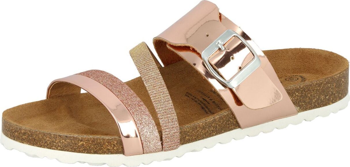 Pantolette aus Synthetik, verstellbare Schnalle, Lederdecksohle, dämpfungsaktive EVA-Laufsohle, Fußbett aus Kork/Kautschuk.
