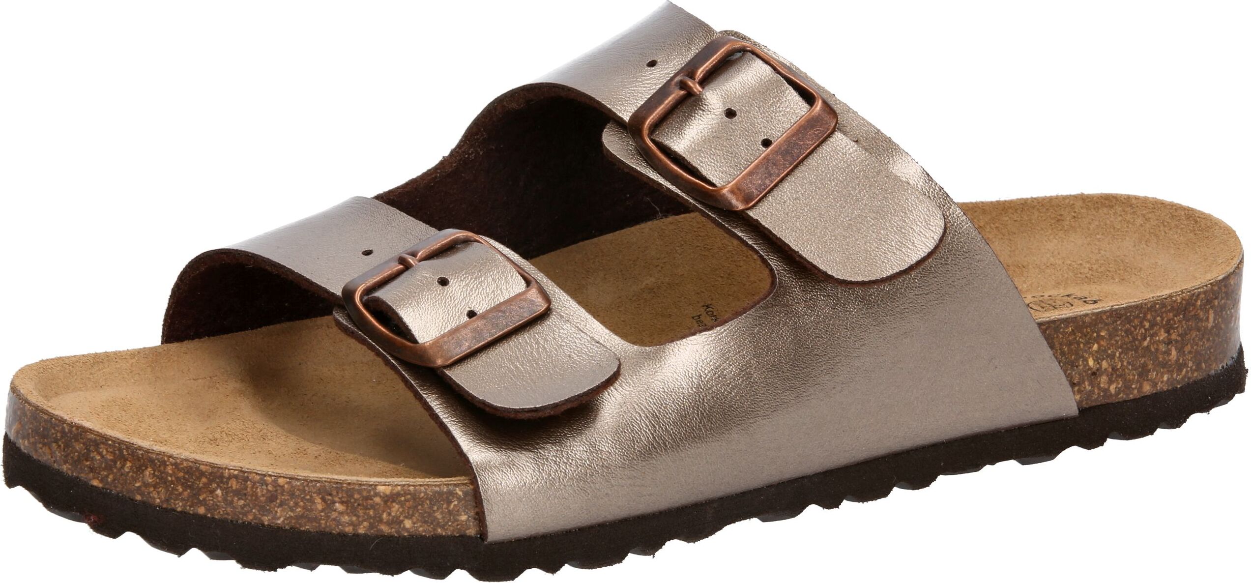 Schicke Pantolette Bioline Platino in Bronze von Lico, Obermaterial aus hochwertigem Synthetik, zwei verstellbare Schnallen, angenehme Lederdecksohle, dämpfungsaktive EVA-Laufsohle, Fußbett aus einer Mischung von Kork und Kautschuk