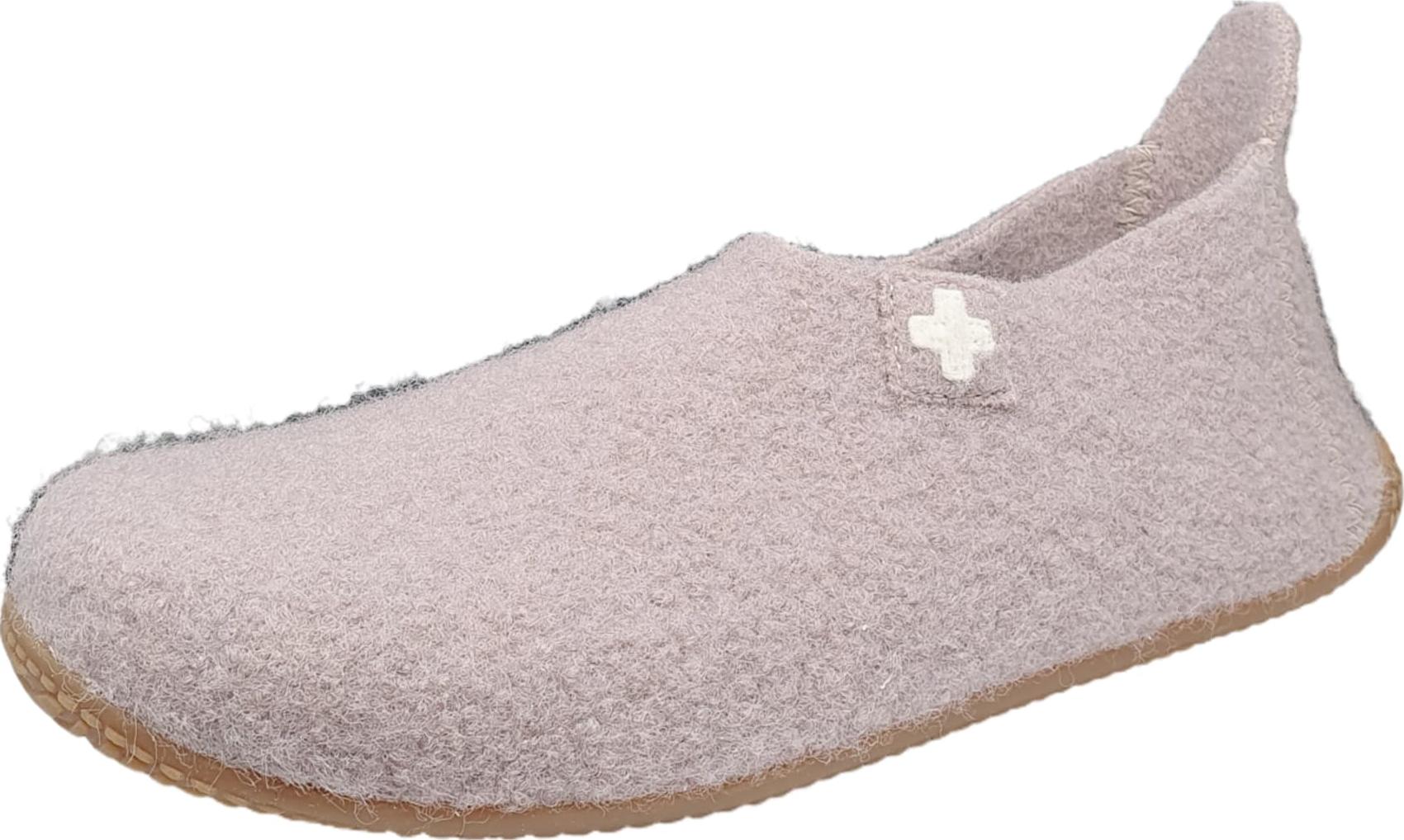 Ein bequemer Hausschuh für Damen, Herren und Kinder, gefertigt aus gewalkter Schurwolle mit flauschiger Lammfell-Innensohle und Schweizer Kreuz-Applikation. Obermaterial und Decksohle aus 100% reiner Schurwolle sind atmungsaktiv und temperaturregulierend.