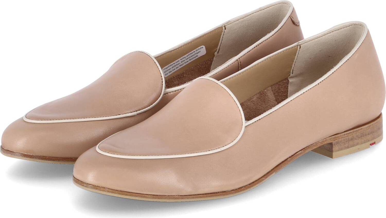 Das glatte, langlebige Echtleder in Beige wird durch den weißen Saum am Einstieg und am Schuhdeck stilvoll eingefasst, wodurch eine klare, gepflegte Optik entsteht. Die runde Spitze und der flache 2 cm Blockabsatz in Holzoptik unterstreichen den entspannten Charakter, während die flexible Ledersohle mit Synthetikbeschlägen ein angenehmes Laufgefühl begünstigt.
