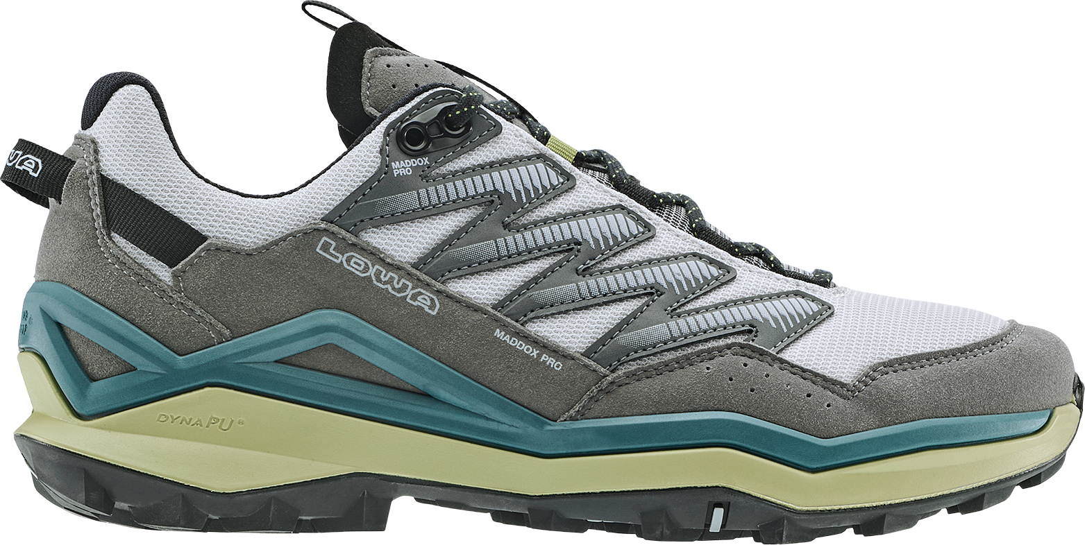 Das bewährte Zwischensohlensystem aus LOWA® DYNAPU® als auch der Schaft aus robustem Ripstop-Obermaterial und atmungsaktivem Textilfutter gewährleisten ein sportliches Maß an Flexibilität - sodass der MADDOX PRO LO gediegenere Tempi als auch dynamische Fast-Hiking-Passagen problemlos meistert. Das Naturell des Schuhs spiegelt sich auch in seinem optischen Auftritt wider: Mit dem scharfkantigen, präzisen Design ist der MADDOX PRO LO ein wahrer Eyecatcher und setzt einen spannenden Akzent im Segment dynamischer Light-Hiking-Halbschuhe.