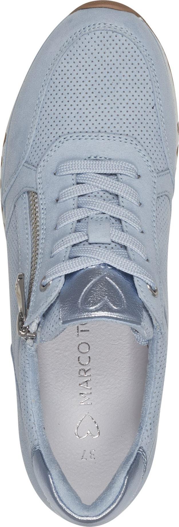 Dieser Marco Tozzi Low Sneaker bringt Leichtigkeit in den Alltag: blau-hellblaue Farbgebung, silbern schimmernde Highlights und eine charakteristisch gesteakte Oberfläche setzen dezente Akzente. +
