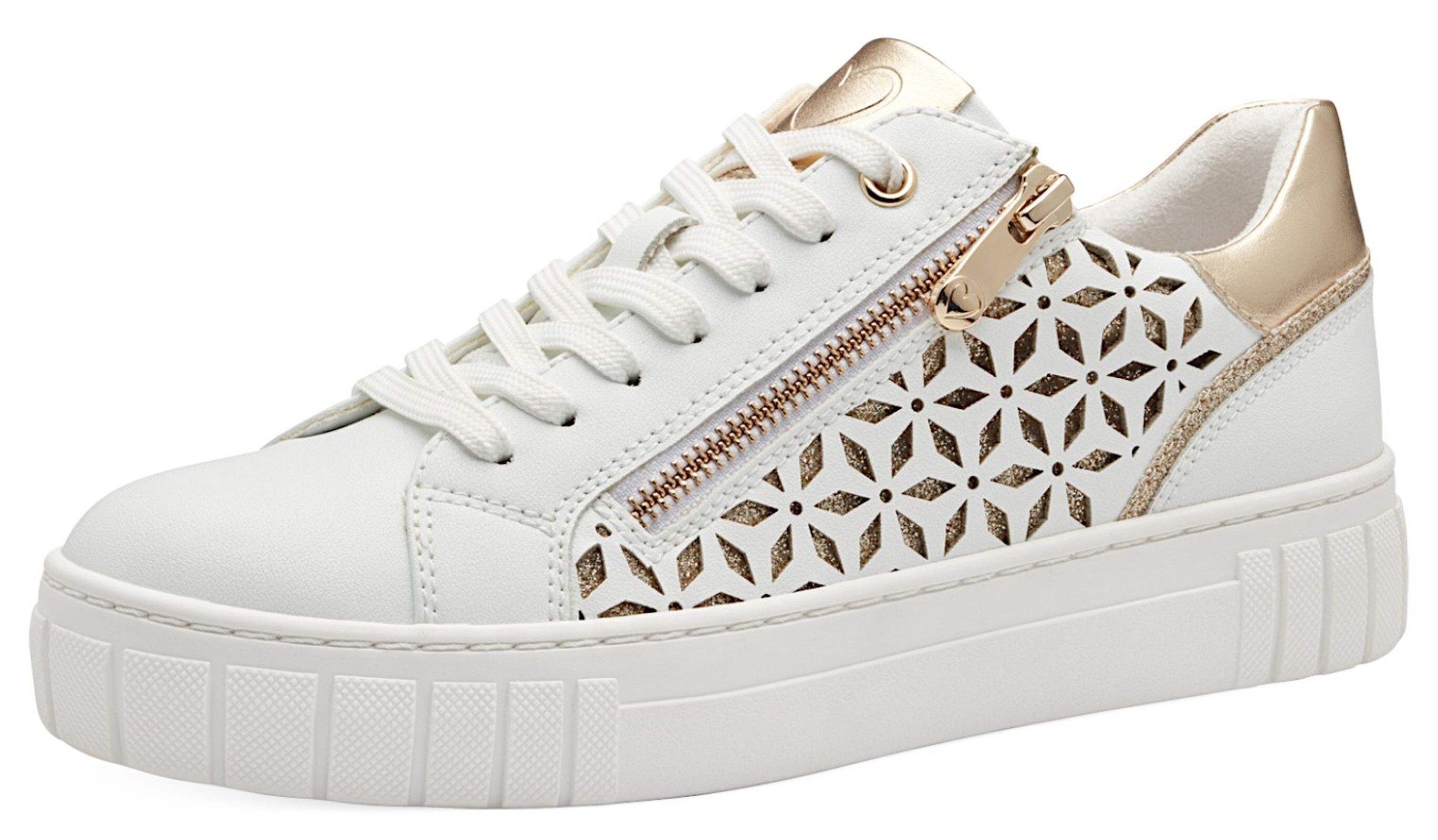 marco tozzi Plateausneaker, Freizeitschuh, Halbschuh, Schnürschuh mit unterlegtem Lochmuster (gold/weiß)