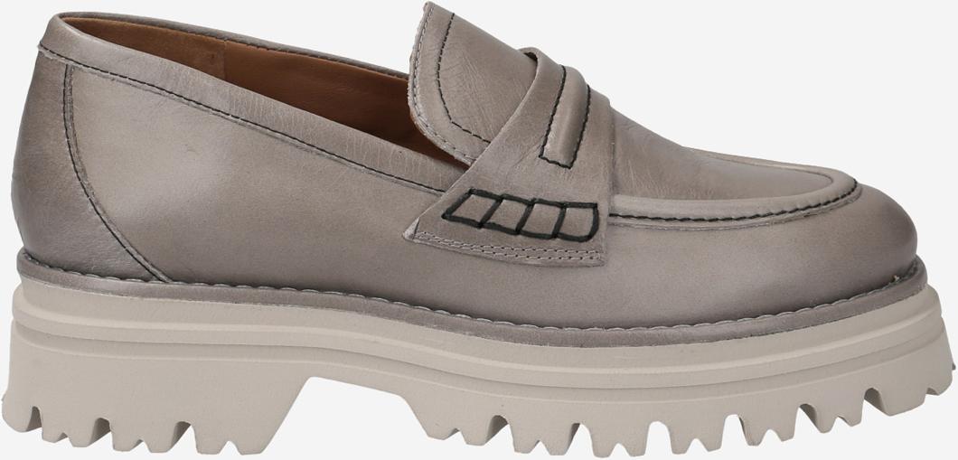 Dieser Penny-Loafer von Maripé erhält durch die Plateausohle einen futuristischen Look und durch den individuellen Farbverlauf einen authentischen Vintage-Charakter. Dunkle Kontrastnähte definieren das Design und betonen die handgearbeiteten, groben Ziernähte.