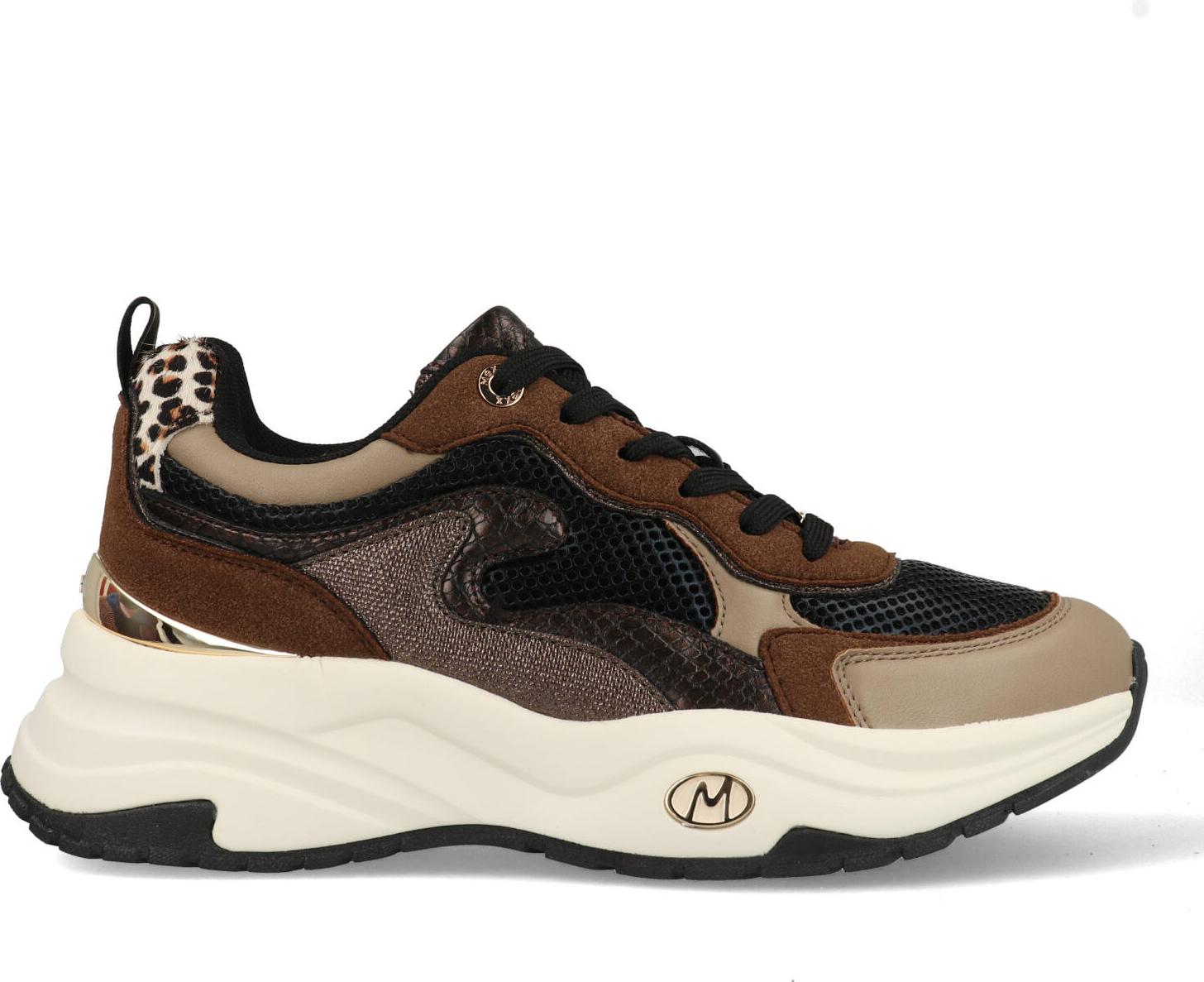 Der braune Grundton wirkt warm und vielseitig, Goldakzente und Markendetails setzen feine Kontraste. Modern designte Synthetik und Mesh-Bereiche schaffen eine dynamische Oberfläche.
