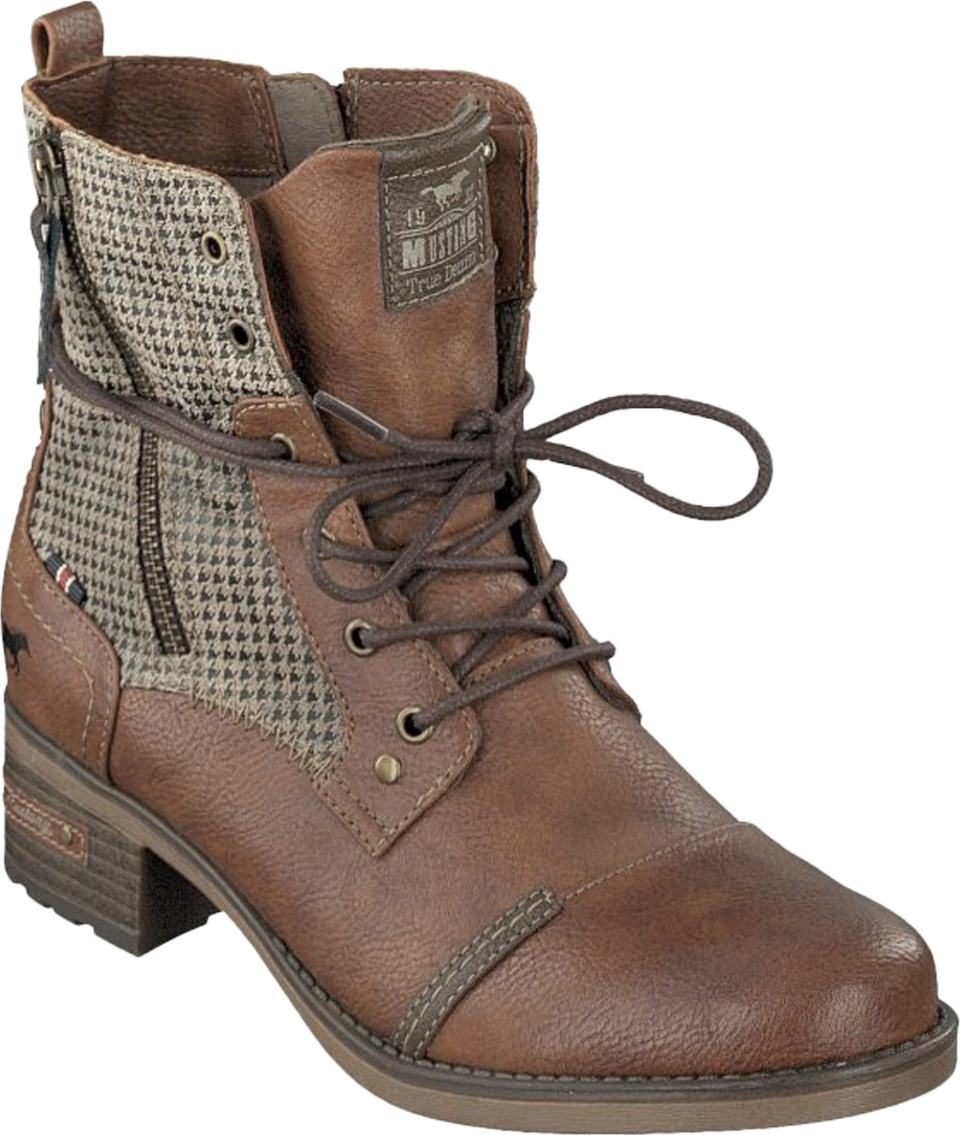 Diese individuelle Damen Stiefelette von Mustang ist ein Must Have für die neue Herbst Winter Saison.Gefertigt aus authentisch genarbtem Kunstleder in Braun besticht sie durch den farblich abgesetzten Einsatz in Grau mit Hahnentritt Muster. +