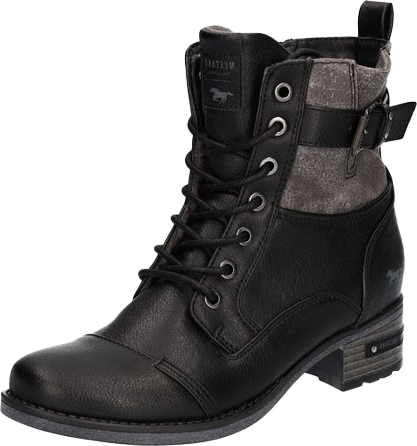 Diese individuelle Damen Schnürstiefelette in Schwarz von Mustang besticht mit authentisch genarbtem Kunstleder und sorgt für einen coolen Auftritt. +