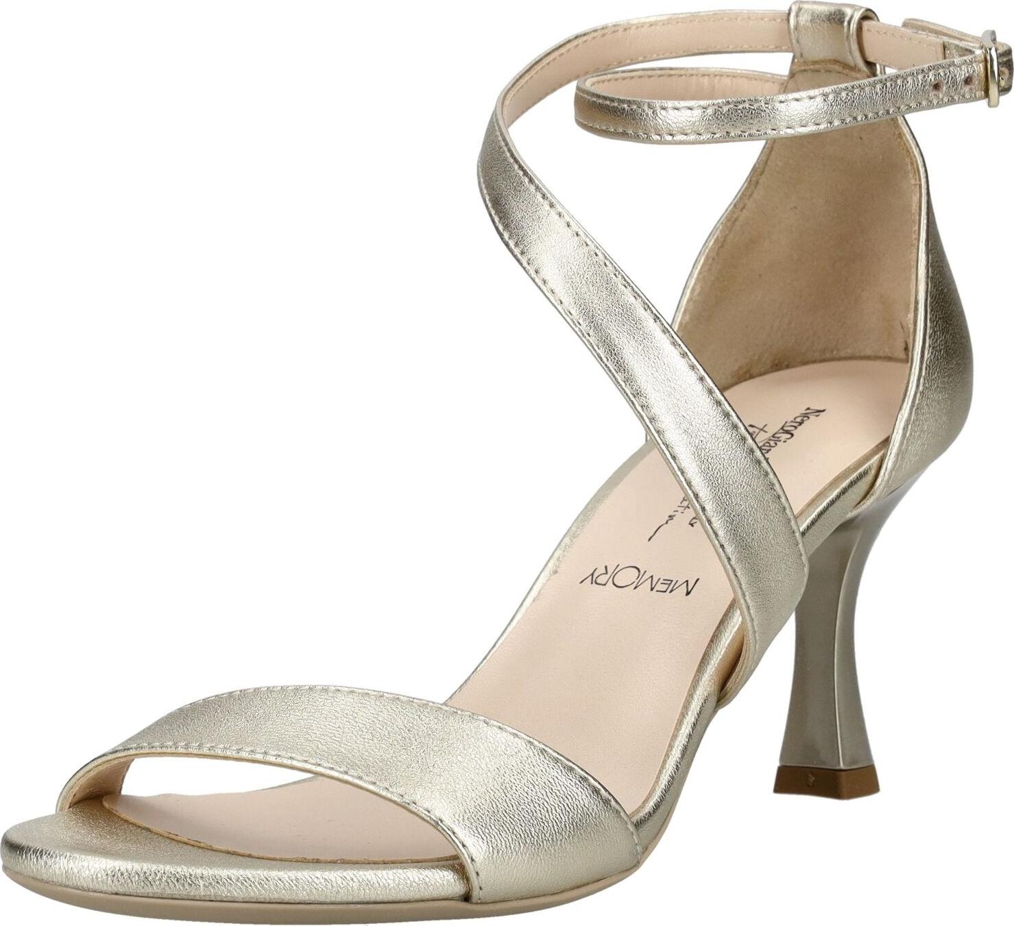 Die schimmernde Metallic-Optik verleiht dem Modell eine luxuriöse Ausstrahlung, während die filigranen, überkreuzten Riemen den Fuß stilvoll in Szene setzen und für sicheren Halt sorgen. Der schlanke, leicht ausgestellte Absatz unterstreicht die elegante Silhouette und streckt optisch das Bein, ohne dabei auf Komfort zu verzichten.