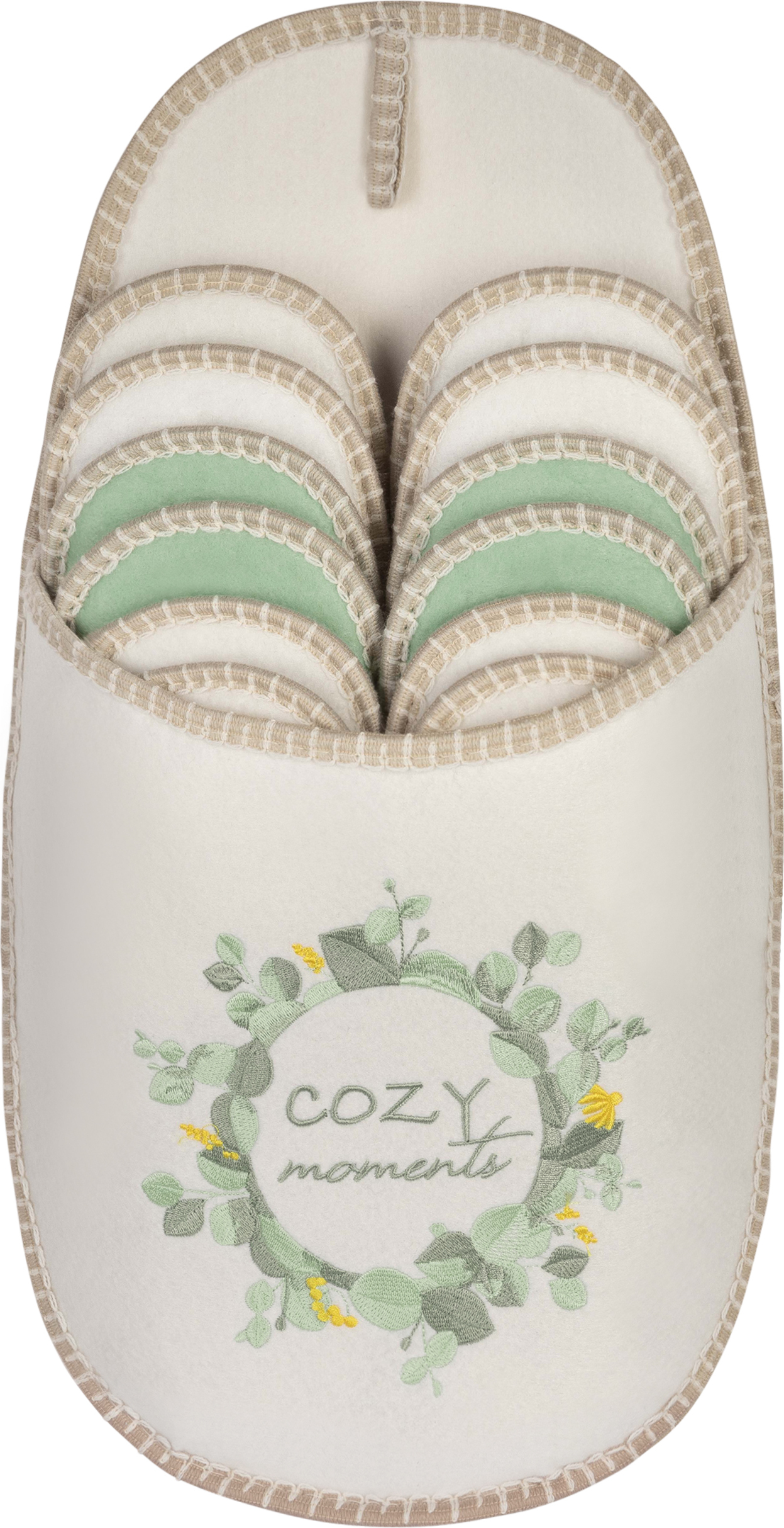 Gästepantoffel und Hausschuhe für Damen, Herren und Teenager | 6 Pantoffel Sets (je zwei Paar in den Größen 36/39, 40/42, 43/45) | Dekorativ untergebracht in einer Aufbewahrungstasche | Waschbar bei 30 Grad | Farbe der Aufbewahrungstasche: beige | Motiv: Cozy Moments
