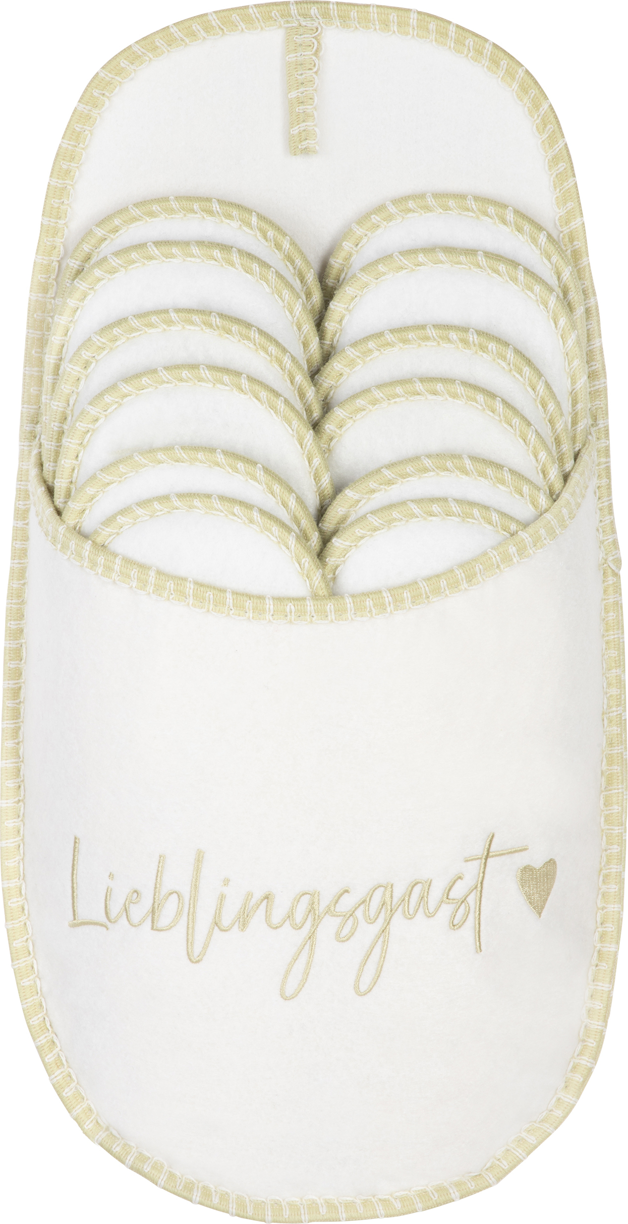 Gästepantoffel und Hausschuhe für Damen, Herren und Teenager | 6 Pantoffel Sets (je zwei Paar in den Größen 36/39, 40/42, 43/45) | Dekorativ untergebracht in einer Aufbewahrungstasche | Waschbar bei 30 Grad | Farbe der Aufbewahrungstasche: beige | Motiv: Lieblingsgast