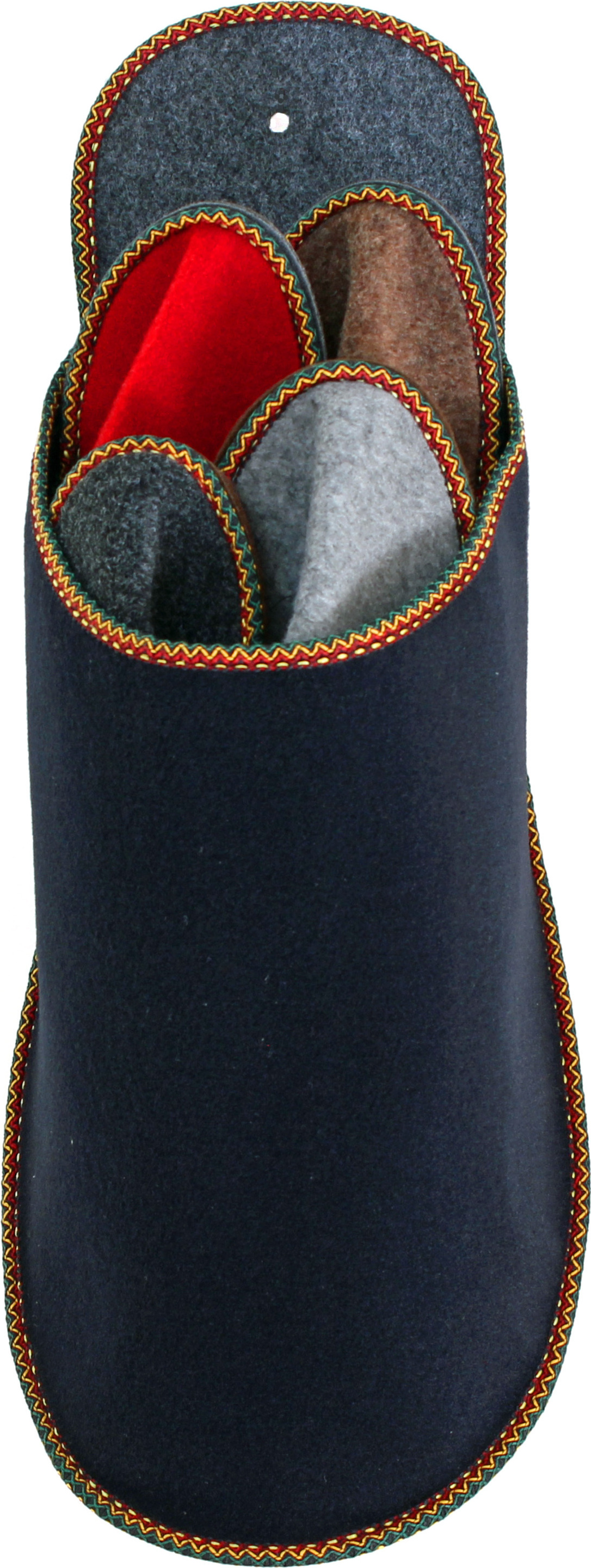 Und das Beste: Wir haben 4 Pantoffeln in einem tollen Set kombiniert.Was macht unser Set besonders? 4 Paar Hausschuhe aufbewahrt in einem großen “Überpantoffel” - Farbe (Überpantoffel): wahlweise rot / bordeaux / anthrazit / grau Geniales Spannsystem, dass den Hausschuh daran hindert, ständig vom Fuß zu fallen Die Besucherhausschuhe sind faltbar &, absolut platzsparend Handmade in Germany Praktischer “Slip On” Verschluss für schnelles Aus- &, Anziehen Langlebiger, hochwertig vernähter Filz Hausschuh Passend für die durchschnittliche Schaft- &, Spannweite Stilvoll mit bunter Bordüre für Damen &, HerrenWas sind die Vorteile von Filz?Filz schmiegt sich als besonders weicher Stoff perfekt an den Körper an und hält effektiv warm. Er gilt als sehr robust und pflegeleicht, zudem ist unser langlebiger Filz aus 100% hochwertigem Polyester atmungsaktiv und sorgt für ein angenehm trockenes Fußklima zu jeder Jahreszeit.Die stoßdämpfende, beschichtete Laufsohle aus Filz kann zudem den Gang weich abfedern.