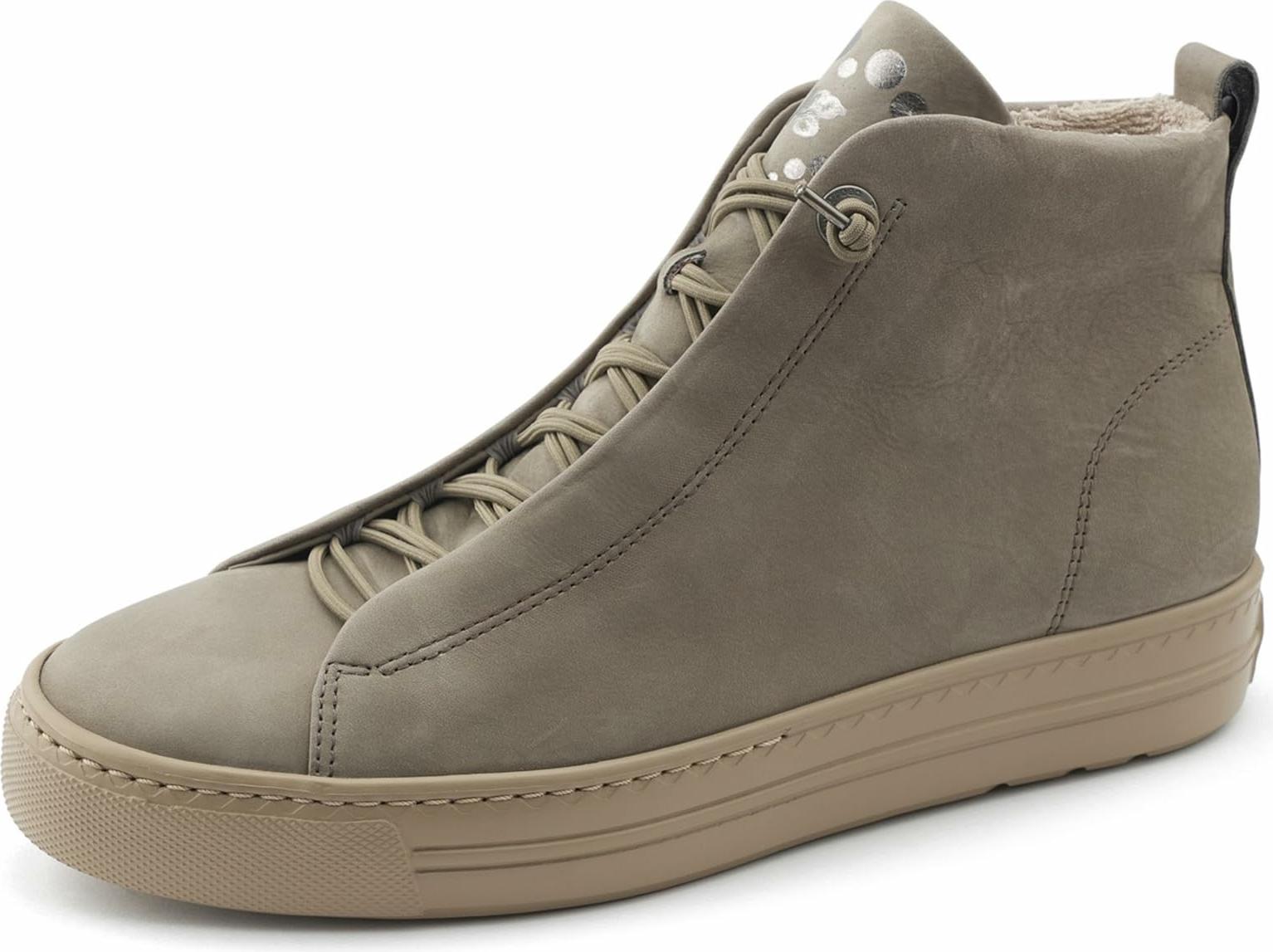 Zeitgemäßer Komfort in raffinierter Ausführung: Der High Sneaker von Paul Green setzt auf taupefarbenes Rauleder mit samtiger Haptik, runde Spitze und eine robuste Cupsohle, deren Bumper dem Design eine markante Linie verleihen. +