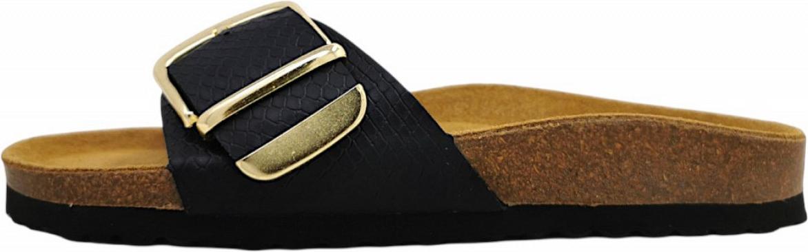 stylische Damenpantolette im edlen Design Muster: Tiermuster (Reptilienmuster) Obermaterial: Lederimitat (Synthetik) Innenmaterial: Synthetik Decksohle: geformtes Lederfußbett eingebettet in einer Korksohle Laufsohle: EVA (Kunststoff, der in seiner Weichheit und Flexibilität, Kautschuk oder umgangssprachlich gummiartig ist) durch die Schnalle vorn individuell einstellbar Farben: Schwarz, Weiß, Cognacbraun