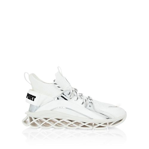 Obermaterial aus gestrickten Socken und Funktionsmaterialien überlappen sich für einen sicheren und passgenauen Sitz. Ösen verbinden die Multimaterial-Schale Zweifarbige Schnürsenkel Gummierter Aufnäher mit dem kultigen Tiger auf der Zunge Plein Sport auf der Fersenkappe Gummierte, ergonomische, stoßdämpfende, ultraleichte und perforierte Hightech-Zwischensohle Für optimalen Grip geformte Laufsohle