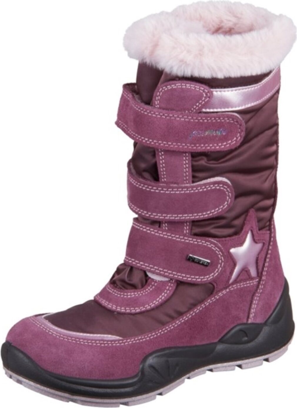 wasserdichter, gefütterter Winterstiefel für die größeren Mädchen ein toller Schuh, mit einem hohen Nutzwert in den Farben: Lila und Elfenbein/Creme der kuschelige Kunstfellrand und die Steppnähte machen das besondere Design aus weiches Velourleder und Textil (Synthetic im Schaftbereich) gefüttert mit kuscheligem Warmfutter die vordere Lasche ist zum Einstieg nach vorne klappbar und an beiden Seiten mit einem Schneefang unterlegt die Kletties verschließen und fixieren den Schuh am Fuß herausnehmbare Filzinnensohle mit anatomisch geformtem Fußbett, diese kann gewaschen und getrocknet werden, was Sauberkeit und Hygiene im Innern des Schuhs ermöglicht die griffige, angespritzte Laufsohle macht den Schuh sehr leicht und robust auch diese Schuhe haben das Primigi Patent Sky Effect System =, leicht, flexibel, stoßdämpfend, antibakteriell, atmungsaktiv