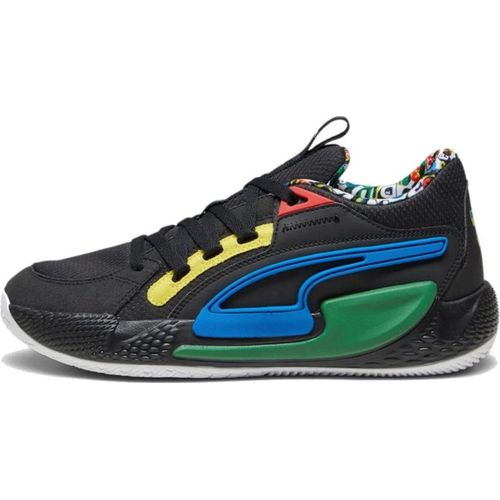 der PUMA Court Rider Chaos Trash Talk hebt sich mit seinem modernen Design und seinen herausragenden Leistungseigenschaften von der Masse absorge für Chaos und dominiere das Spielfeld mit Stil niedrige Silhouetteperformance-Obermaterial aus Netzhalt durch TPU-Zwischensohlegummi-Außensohle mit hoher AbriebfestigkeitPUMA Branding-Details Farbe: schwarz/blau/grün