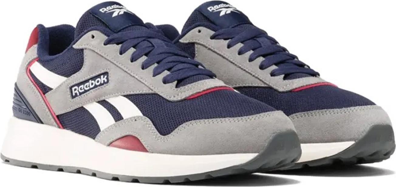 Der Reebok GL1100 Unisex Sport Sneaker Freizeitschuhe 100201237 in der Farbkombination Blau/Grau/Rot kombiniert Retro-Design mit modernem Komfort. +