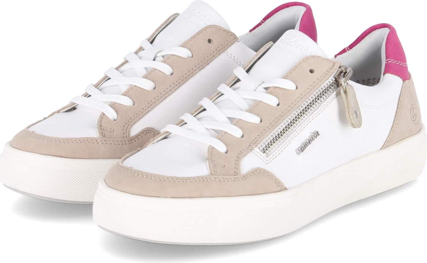 Urbaner Minimalismus trifft Komfort: Der Remonte Low Sneaker in Weiß aus hochwertigem Glattleder erhält mit beigen Schnürsenkeln und Zipper eine elegante Note, während die pinke Fersenklappe einen sportlichen Farbakzent setzt. +