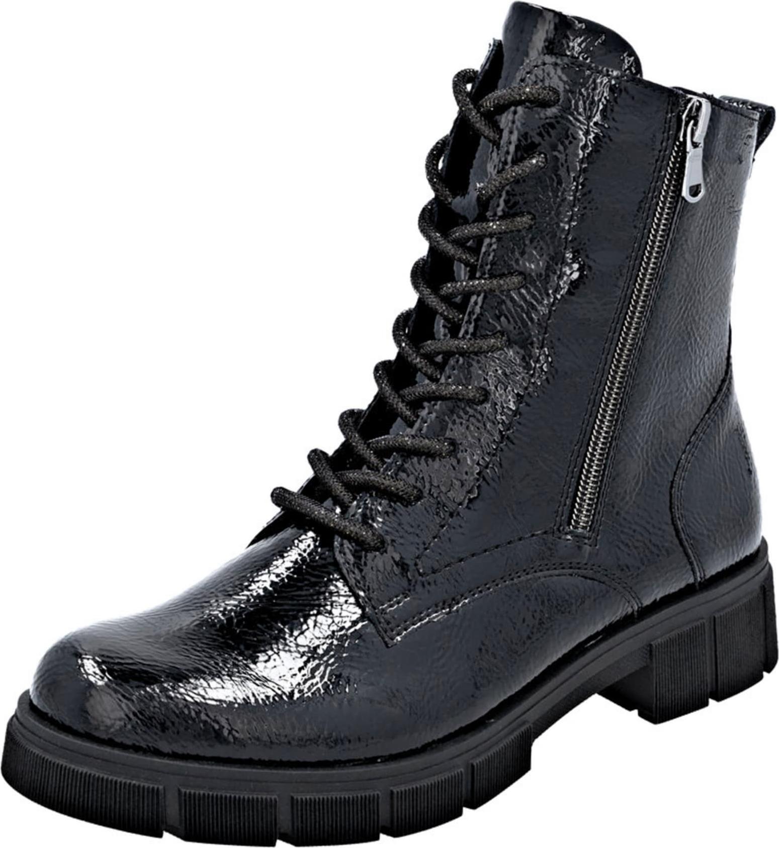 Remonte Damen Schnürboot aus Lacklederimitat in Schwarz mit Schnürung, Reißverschluss und Futter aus weichem Samtvelour